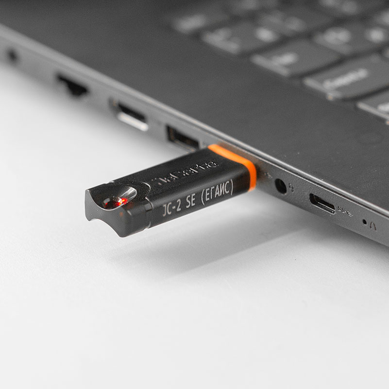 JaCarta — сертифицированный ФСТЭК и ФСБ носитель для хранения усиленной квалифицированной электронной подписи. Имеет встроенную криптографию. Для шифрования, подписания и расшифровки документов используется само устройство. Можно установить два PIN-кода — для идентификации пользователя и формирования ЭП.