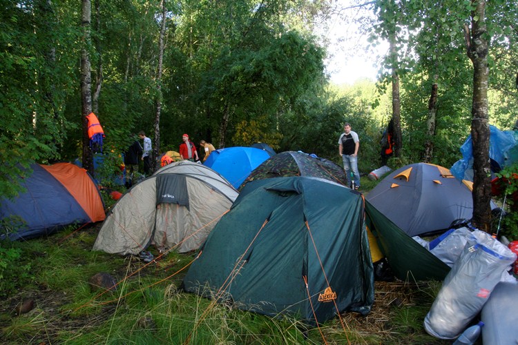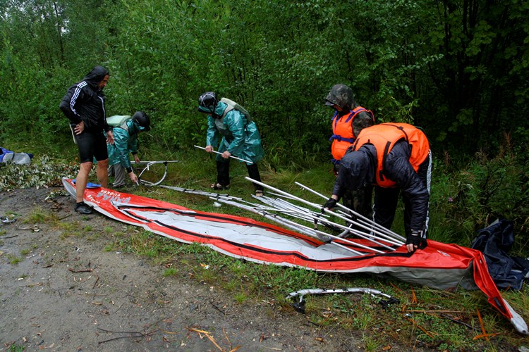 Сразу же перед гребцами возникло первое препятствие: холодный ливень. Струи воды, с невероятной скоростью и страшной силой извергающиеся с неба, не щадили ничего: ни байдарки, ни оставленные на земле сумки, ни еду… Влага щедро заливалась в резиновые сапоги и за шиворот. Неприятные мурашки бегали по телам сотрудников «Тензора». Впору было плюнуть, запрыгнуть обратно в автобус и буркнуть: «Домой!». Но никто из 30 человек, столкнувшихся с суровой карельской погодой, не испугался. Да, собирать байдарки коченеющими от холода руками было сложно. Еще сложнее было заставить себя сесть в холодную лужицу внутри лодки и грести под бесконечный ритм, выбиваемый дождевыми каплями по бортам. Но, собрав волю в кулак и стиснув плотнее зубы, километр за километром тензоряне приближались к первой стоянке, где их ждал теплый костер и сухие (надеемся) спальники.