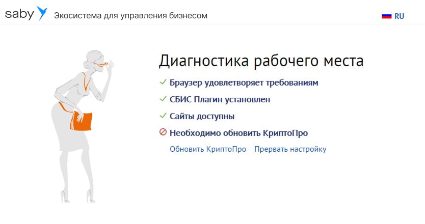 Мастер проверит, есть ли на вашем компьютере приложения для работы с ЭП. Выполняя рекомендации, установите или обновите ПО — напротив всех пунктов должна появиться зеленая галочка.
