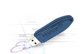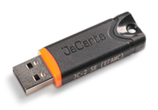 Токен JaCarta — это устройство с защищенной картой памяти, на которой хранится информация об электронной подписи. Это один из безопасных вариантов для хранения ЭП: носитель сертифицирован ФСТЭК/ФСБ, имеет пароль и усиленную защиту данных.